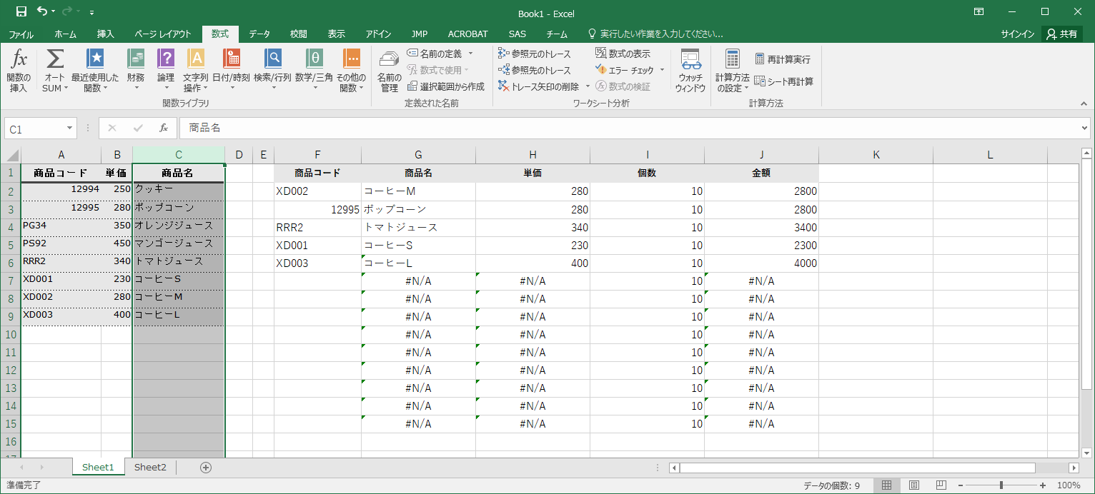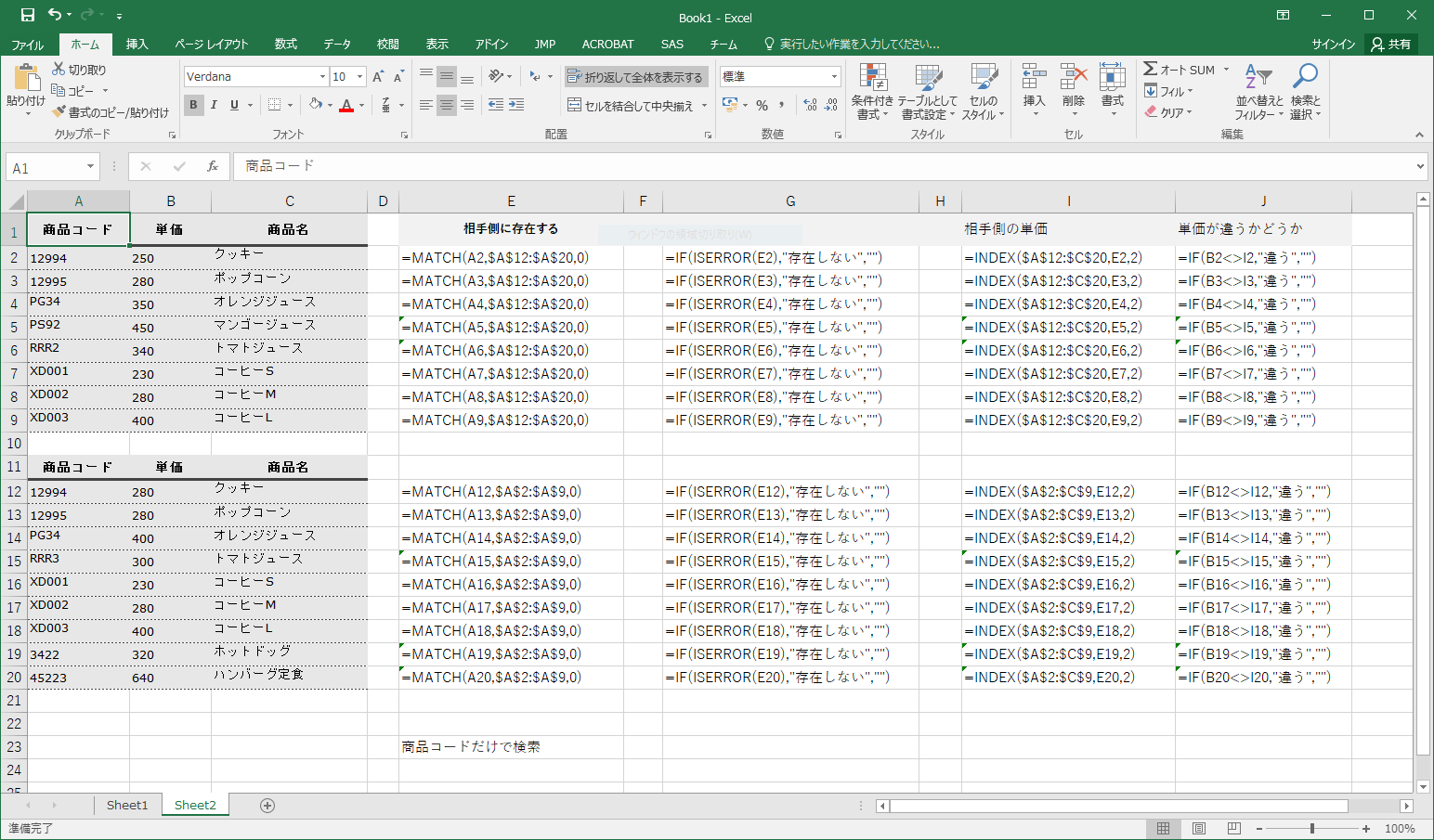 デモでは、A1から始まる表に、もう一方の表に同じ商品があるかどうか、あるなら単価は同じかどうかを判断する式を追加した。もう1つの表にも同じ式を付け加えること。このとき、最終的な表示結果は「ない」「あるが単価は違う」「あって単価も同じ」のいずれかの文字列を表示すること