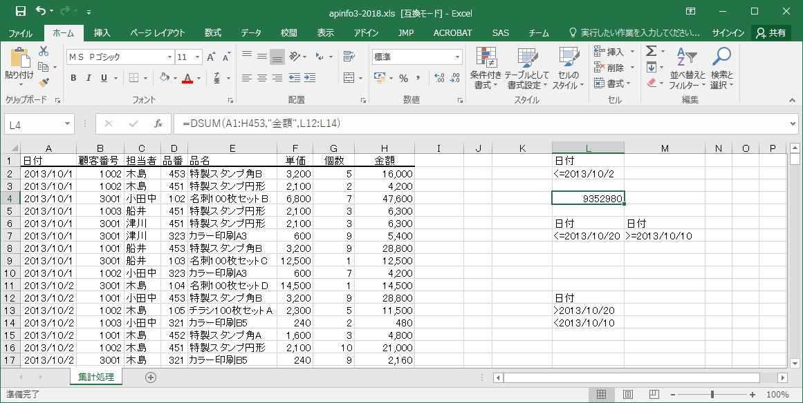 第3回のワークシートにあるデータを利用して、データベース関数を使って集計をすること。担当者ごとの10月の期間だけの売上表を作成すること。最終的には担当者ごとの表になっていればいいので、それ以外の部分は自由にセルを利用してかまわない。