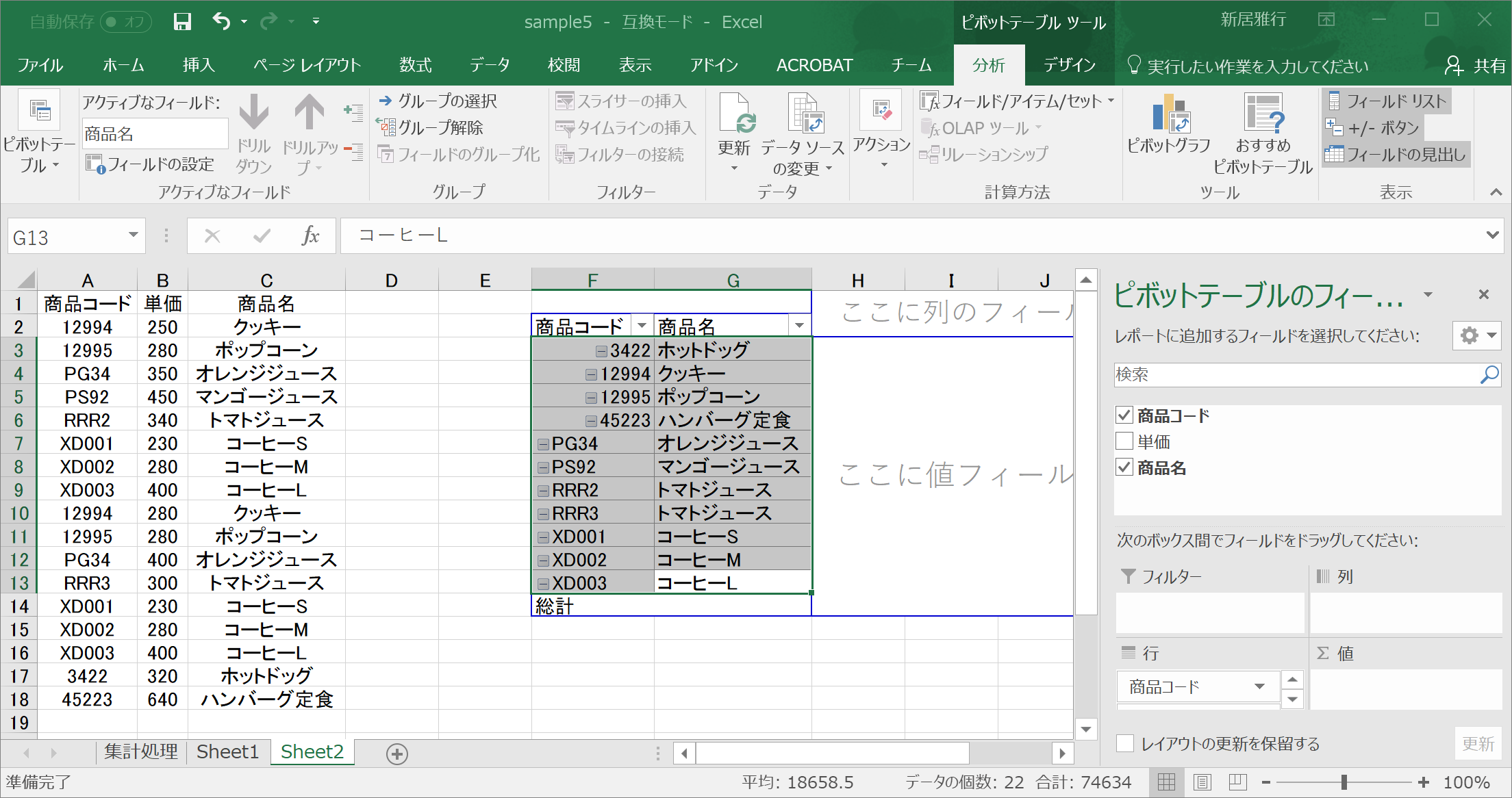 この練習問題はやりようはいろいいろありますが、1つの方法としては、2つ表をまとめてしまい、その表に対してピボットテーブルを作り、列ラベルに「商品番号」「商品名」を両方並べる事です。ですが、このままでは小計が表示されているので、図のようにピボットテーブル内の「商品コード」の列の中を右クリックして「“商品コード”の小計」のチェックを外し、小計表示をやめます。すると、後の図のようになり、あとは適当にコピー&ペーストしてきれいな表に仕上げるなどの作業を行えばいいでしょう。ここでトマトジューズに異なる2つの商品コードがあることも分かるわけです(これをなんとかすることはやりようがないので、そのままでいいでしょう)。