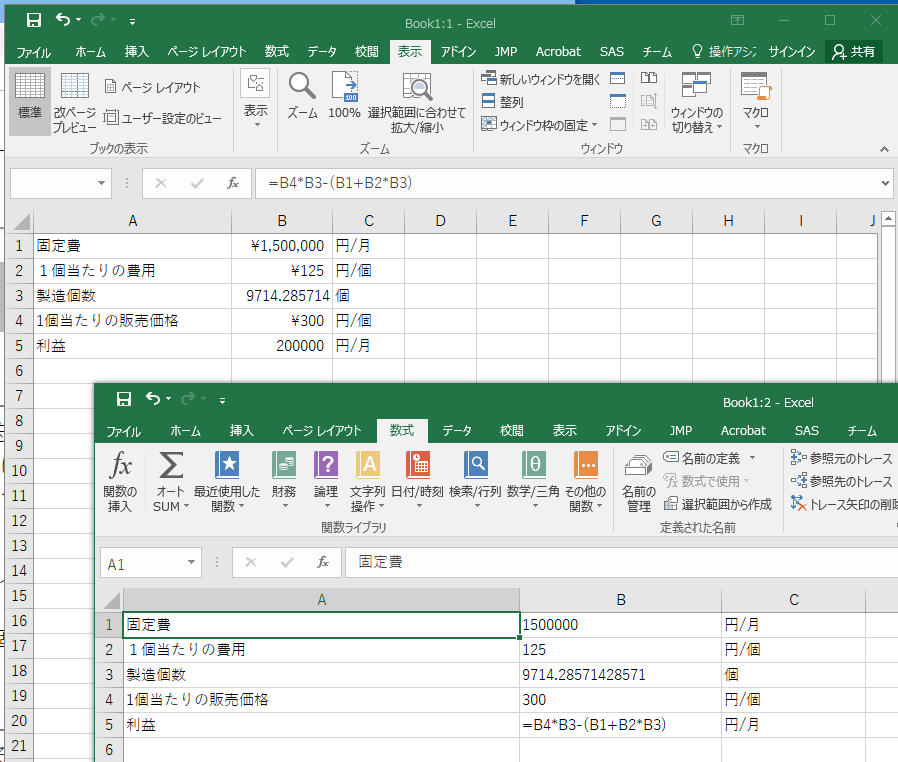 製品を作って販売するという状況を考える。ある商品を作るのに、月間1,500,000円の固定費と、1個あたり125円の費用がかかるとする。
