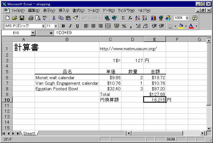 �ȉ��̕\�́A�j���[���[�N�ɂ��郁�g���|���^�����p�ق̃V���b�v����A���[���A�N�Z�T���[�𒍕�����Ƃ��Ɏg�p����v�Z�\��Excel�ō쐬���Ă݂����̂ł��B����Ɠ����\���쐬���Ă݂܂��傤�B