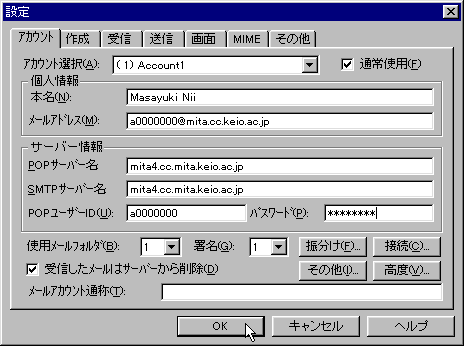 SMTPサーバー名 | mita4.cc.mita.keio.ac.jp、もしかしてmita.cc.keio.ac.jpでもいいかもしれない。授業で説明します |