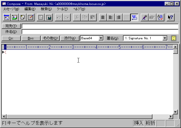 文面は、ワープロなどと同様に編集作業ができる。文字列を選択して、ツールバーのボタンを利用することにより、コピーや貼り付けができる。また、選択範囲のドラッグ&ドロップによる編集もできる。もちろん、ワープロやメモ帳で作成した文面をコピーし、送信メールの文面に貼り付けをしてもかまわない。