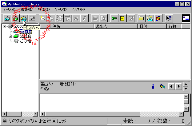 Becky!のウインドウのツールバーにある「巡回チェック」ボタンをクリックする。これにより、メールサーバーを参照し、自分に宛てられたメールをパソコンに取り込む。