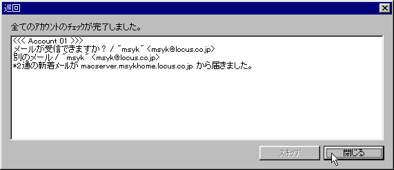 たとえば、次のようなメッセージがダイアログボックスで表示される。ここでは新しくメールが届いていることを表示している。問題がなければ「閉じる」ボタンをクリックする。何らかのトラブルがあった場合には「スキップ」ボタンを押して対処する。