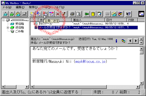 受信メールの受信と、そのメールへの返信を書くには、たとえば以下のように操作する。メールの返信のとき、単にこちらからの返事だけを書いても、送り先は自分の書いた文面までを覚えているわけではないので、それでは内容は伝わらない。そこで、相手の元の文章の一部を引用する。そうすることで、返答の文章もより短く作成できる。