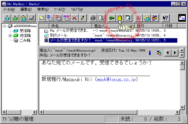 Becky!のウインドウで、ツールバーの「アドレス帳」ボタンをクリックする。