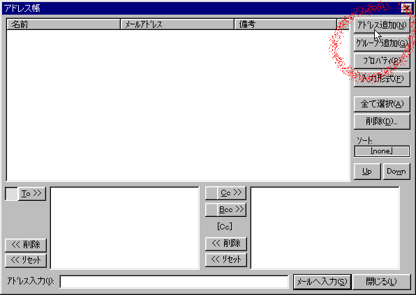 送信先のアドレスをいちいち毎回手入力するのも面倒であるし、間違えるもとになる。そこで、送り先のアドレスを選択入力できるようにしておくと便利になる。Becky!には宛先を記録しておく機能がある。