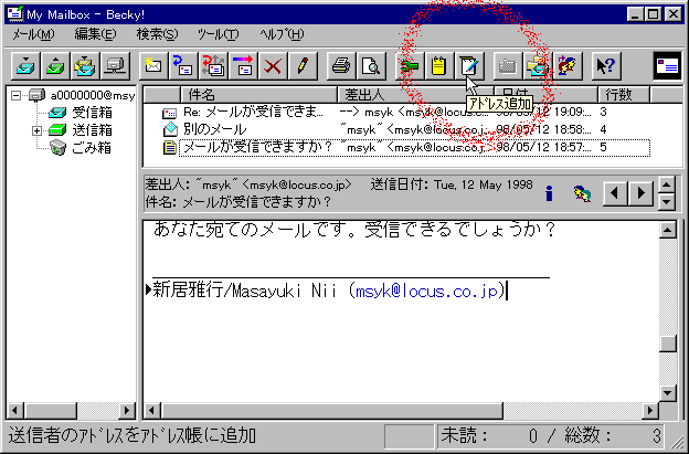 なお、メールを読んでいるとき、ツールバーの「アドレス追加」ボタンをクリックすると、メールの差出人が自動的にアドレス帳に追加される。ボタンをクリックすると、名前やアドレスを入力するダイアログボックスが表示されるが、自動的に名前とメールアドレスが文面から取り出されて設定されている。そのままOKボタンをクリックすると、アドレス帳に追加される。