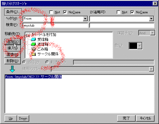 「検索」の文字列は、それが検索対象に含まれるかどうかを調べる。たとえば、Subjectに対して「News」と指定すると、Newsという文字列が件名に入っているメールはすべて振り分け対象になる。