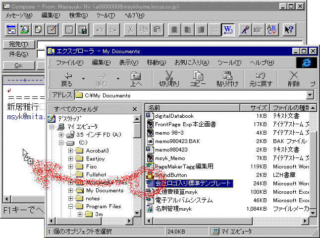 まず、メールの作成ウインドウを用意しておく。そして、添付したいファイルをたとえば「WindowsNTエクスプローラ」でアイコンとして見えている状態にしておく。つまり、ファイルのあるフォルダの内容が一覧されていればよい。そして、送付したいファイルを、エクスプローラから、Becky!の作成中の文面の中にドラッグ&ドロップする。