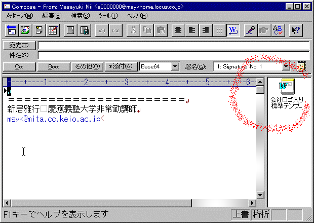 この後にメールの作成を行うと、このように自動的に末尾に署名がつけられている。