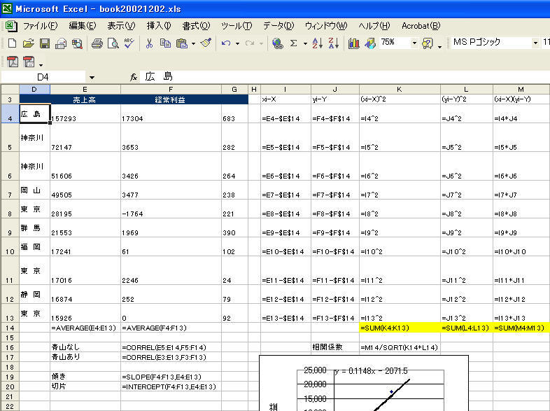 今日のデータのサンプルを利用して相関係数を求める。売上高と店舗数の相関係数を求めてみよう。また、この関係をグラフ(散布図)に描いてみよう。