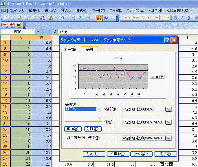 「日平均」つまりB列の系列だけが残ります。さらに、「項目軸ラベルに使用」という設定箇所で、A列のデータ、つまり範囲としては、A7:A36を指定します。