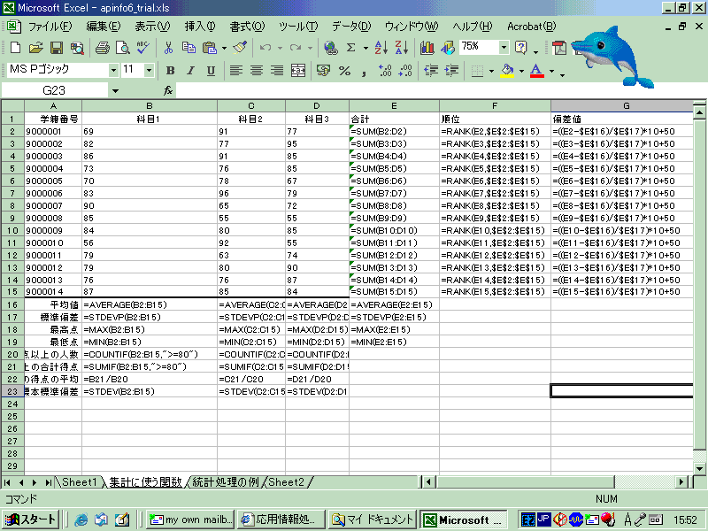 STDEV(引数) | 引数の標本標準偏差(個数−1で割る方)を求める |