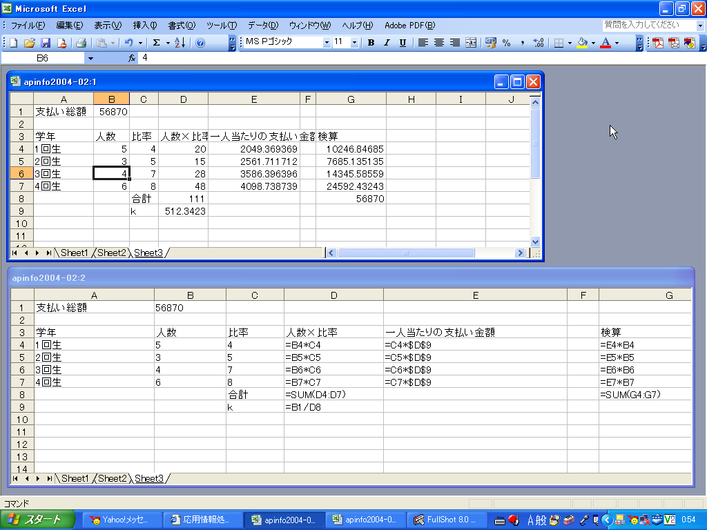すると、s1+s2+s3+s4=56,870だから、まあ、簡単な1次方程式で、kの値は求まり、一人一人の支払額は決まる。だけど、これをワークシートで展開してみる。