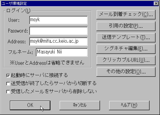 - 次のようなダイアログボックスになる。「User」には、メールアドレスのアカウント名(@より前の文字)を入力する。「Address」には、メールアドレスを入力する。「フルネーム」には、名前の文字列を入力する。「Password」は特に入れても入れなくても良いが、入力する場合、これはインターネットメールアドレスのパスワード(telnetで接続するときのパスワード)を指定する。Passwordを空欄にすると、使うたびにパスワードを入力するので、面倒ではあるが、他人に使われる心配は減る