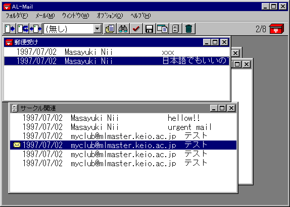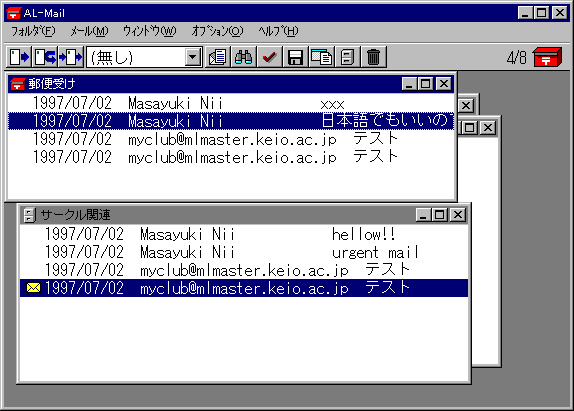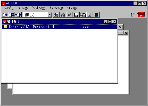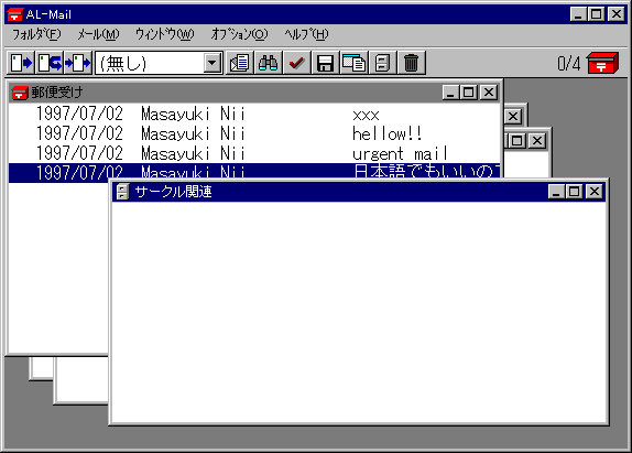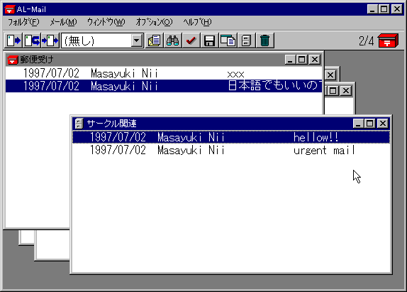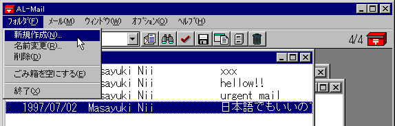たくさんのメールを受信受けに並べていても、必要なメールを探し出すのは困難になる。そこで、フォルダを新たに作成し、そこにメールを分類できるようにする。フォルダとは言っても、AL-Mail内ではウインドウとして表示される。フォルダの作成と、手動によるフォルダの移動の方法について説明する。