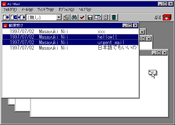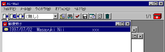 - AL-Mailのウインドウの「郵便受け」にメールが一覧されている。ウインドウを開いた後から届いたメールも取り込むには、図のマウスポインタが示している郵便箱ボタンをクリックする