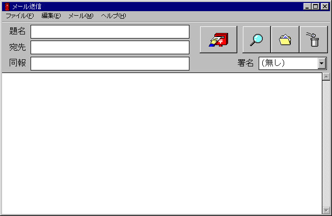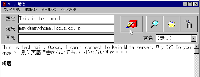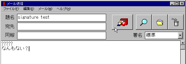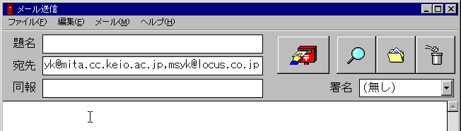 - 「メール」メニューの「送信」を選択する。あるいは「S」キーを押す。あるいは、以下のマウスポインタが指しているツールバーのツールをクリックする