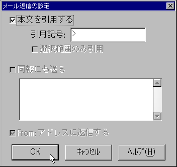 - 次にのようなダイアログボックスが出てくる。ここでは、「本文を引用する」というチェックボックスを入れておいてOKボタンを押す