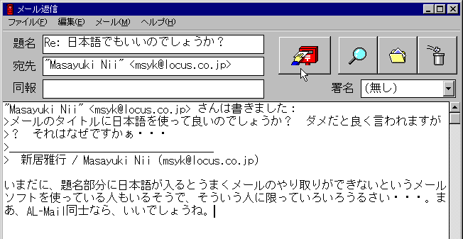 - 送信メールを作成するウインドウが表示するが、元のメールの文章が「>」記号によって引用されている。ここに追加でメッセージを記入し、あとは送信のときと同様に行う