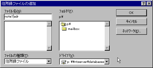 - 新しいアドレス帳を用意するために、「追加」ボタンを押すと、次のようなアドレス帳のファイルを指定するダイアログボックスが出てくる。ここは「P:\」ドライブに、ファイルを作成するが、たとえば、「note1.adr」などとファイル名を入力すればよい。ドライブは下の方の「ドライブ」というドロップダウンリストを選ぶ