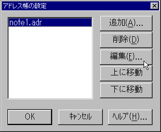 - 最初のダイアログボックスが出てくるが、作成したアドレス帳ファイルを選択して、「編集」ボタンを押す