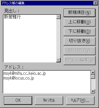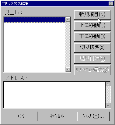 - 「新規項目」ボタンを押せば、いくつも登録できる。登録が終われば、OKボタンを押す。アドレス帳の管理ダイアログボックスに戻るのでOKボタンを押せばいよい。