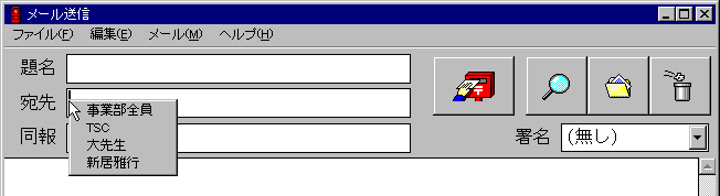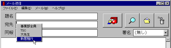 - メール送信のウインドウで、Ctrl+Aを押す。あるいは「メール」メニューの「宛名選択」を選択すると、次のように、アドレス帳に入力した項目がポップアップメニューで表示される。