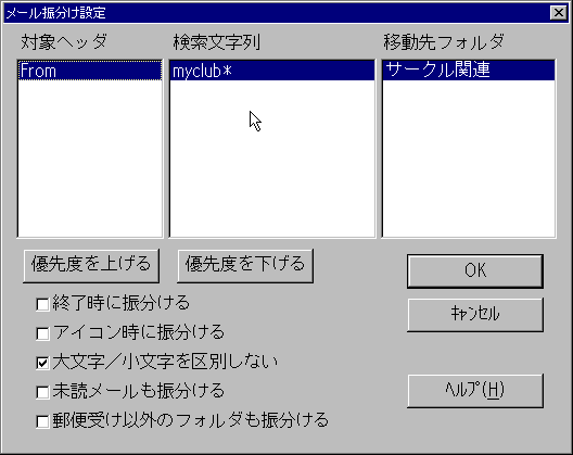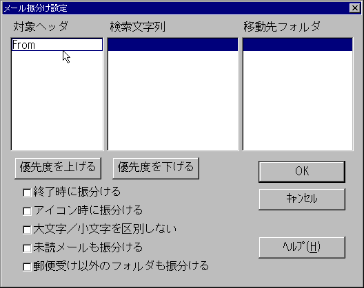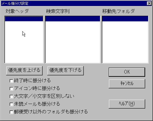 - 「オプション」メニューの「メール振り分け機能」を選択すると次のようなダイアログボックスが表示される
