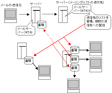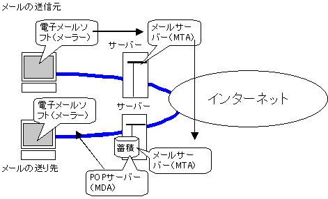 以上のような状態で、送信元で、電子メールを作成し、それを送り先に届けられるまでのプロセスを追って見ます。おおむね、次のような流れです。