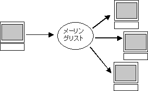 メーリングリストとは、電子メールを複数のアカウントに配信する機能のことを指します。配信先は、もちろん、同一のサーバーでもかまわないのですが、インターネット上のまったく異なるサーバーでもかまいません。模式的に図に示せば、次のようになります(ちょっと簡単すぎる図でが)。