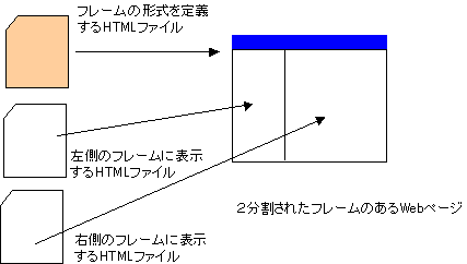 一方、フレームを実現するには、まず、フレームの定義を行うHTMLファイルが必要です。さらに、各フレームに表示するページも作成しておくことになります。2分割のフレームを作成するには、最低限でも3つのHTMLファイルを定義することになります。後で説明しますが、表示するページを切り替えることもできます。