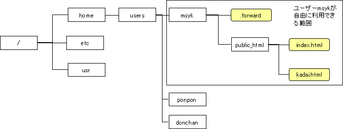 たとえば、/home/usersのようなディレクトリを作っておきます。ここの中に、各ユーザーのホームディレクトリを造ります。たとえば、msykというユーザー向けに/home/users/msykというディレクトリを作るという具合です。普通のユーザーは、このホームディレクトリ内では自由に読み書きはできるものの、その外側では読み込むことしかできないとか、一切何もできない(たとえばどんなファイルがあるかすら見れない)というふうになっています。ここで「外側」とは次のような意味を持っています。ディレクトリのツリー階層を思い浮かべてください。あるユーザーのホームディレクトリよりも下位のディレクトリ(枝分かれしたディレクトリ)は、この場合内側です。外側とは上位のディレクトリ、あるいは上位のディレクトリからたどったディレクトリを外側と呼びます。