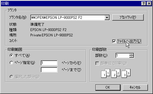 PostScriptプリンタに送るデータをファイルにしたものを「PSファイル」などと呼ばれ、一般には、拡張子は、psです。ただし、上記の方法でファイル化するときには、既定の拡張子が.prnになりますが、これはこれでかまいせん。OKをクリックすると、保存するファイルとフォルダを指定するダイアログボックスが表示されますが、保存したフォルダを忘れないようにします。