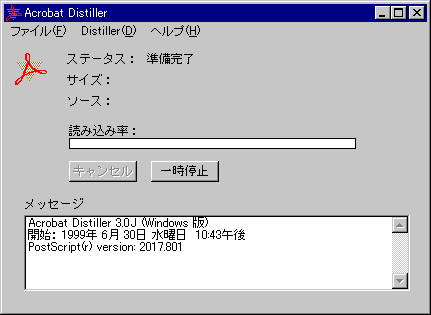 こうして作成したPSファイル(.psあるいは.prnでもOK)を、Acrobat Distillerというアプリケーションを使って、PDFファイルに変換します。以下はそのソフトの画面で、そっけないですが、実際にはファイルをコンバートするという単機能アプリケーションなので、無理もないのかもしれません。作成されたPDFファイルがどこのフォルダにあるかなどは、「メッセージ欄」に出てくるので、メッセージ欄をしっかり見ておけばよいでしょう。