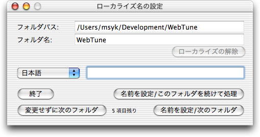 Mac OS X 10.2では、1つのフォルダを言語よって違う名称で表示するといった「ローカライズ名」の機能をサポートしました。ただし、Finder等ではその名前の設定は簡単にできないので作ったのがこのアプリケーションです。