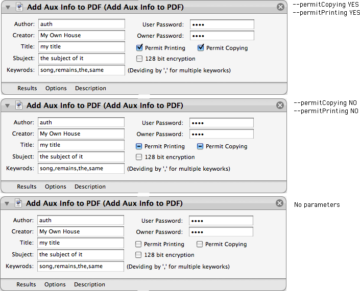 $ /usr/sbin/pdfauxinfo --help Description: pdfauxinfo can set the auxiliary information to PDF file using PDFKit in Cocoa. This is the version 3.x command line tool for Leopard only. Parameters: --sourcePDFFile, -i Input_File_Path Original PDF File path. --convertedPDFFile, -o Output_File_Path Converted PDF File path. --author, -a Author_Name Author info of the converted PDF. --creator, -k Creator_Name Creator info of the converted PDF. --title, -t Title_of_Document Title of the converted PDF. --userPassword, -u User_Password User Password for the converted PDF. --ownerPassword, -x Owner_Password Owner Password for the converted PDF. --permitPrinting, -p [YES|true|1|NO|false|0] Permission for printing the converted PDF. --permitCopying, -c [YES|true|1|NO|false|0] Permission for copying the text. --subject, -s Subject Subject for the converted PDF. --keyword, -k Keyword,Keyword... Keywords for the converted PDF, divide by ','. --encryptionKeyLength, -e length Encryption key length by bit. --debug, -d Debug mode. --help, -h Show this message. For the option permitPrinting and permitCopying, YES or true or 1 means permitting, the others means not permitting. The encryptionKeyLength option must be a multiple of 8 between 40 and 128. If this option is not specified, 40 bit will use to encrypt. If this option is set to other than 40, 128 bit RC4 will use to encrypt. Required options are sourcePDFFile and convertedPDFFile. pdfauxinfo v3.x works just only OS X El Capitan or later.