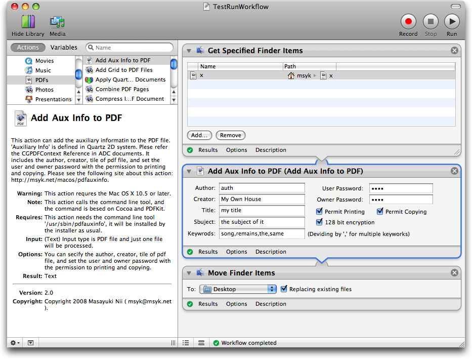 This action uses the command line tool 'pdfauxinfo'. This command line tool is installed with above installer and works on OS X v10.11 or later, so this action requires the same version of Mac OS X.