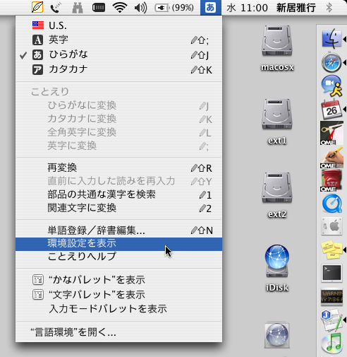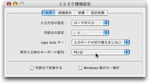 せっかくだから、「英数」「カナ/かな」キーの操作もできないかといろいろ調べて、Tさんにも訪ねたのですが、これは簡単ではないそうです。上記の*.keylayoutファイルは、押されたキーと、発生する文字コードの対応表です。「英数」「カナ/かな」キーは文字ではなく機能を持たせているため、これと同等な操作を組み込むにはカーネル機能拡張が必要になるそうです。つまり、Windowsキーボードの「全角/半角」キーをセンスして、その結果で入力目ニュー項目を切り替えるなどの機能を組み込む必要があるということです。そのため、簡単には行かないということです。