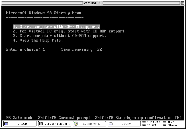 �t���b�s�[�ŋN������ƁA�ȉ��̂悤�ȉ�ʂɂȂ�܂��B�u2�v�̑I�������Aconfig.sys�ɒlj��������̂ŁA�������A�u2�v�ureturn�v�ƃL�[���������ƁA�t���b�s�[�ɂ��N�����s���āAMacintosh�ɓ������ꂽCD-ROM���g�����ԂɂȂ�܂��B�������ĉ��������N���p�t���b�s�[�́AVirtual PC��p�ł͂Ȃ��A�ʏ�̃f�X�N�g�b�v�@�̋N���ɂ��������g���܂��B